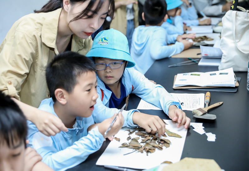 学生正在用心探究树叶品种(钱江源国家公园管理局供图)