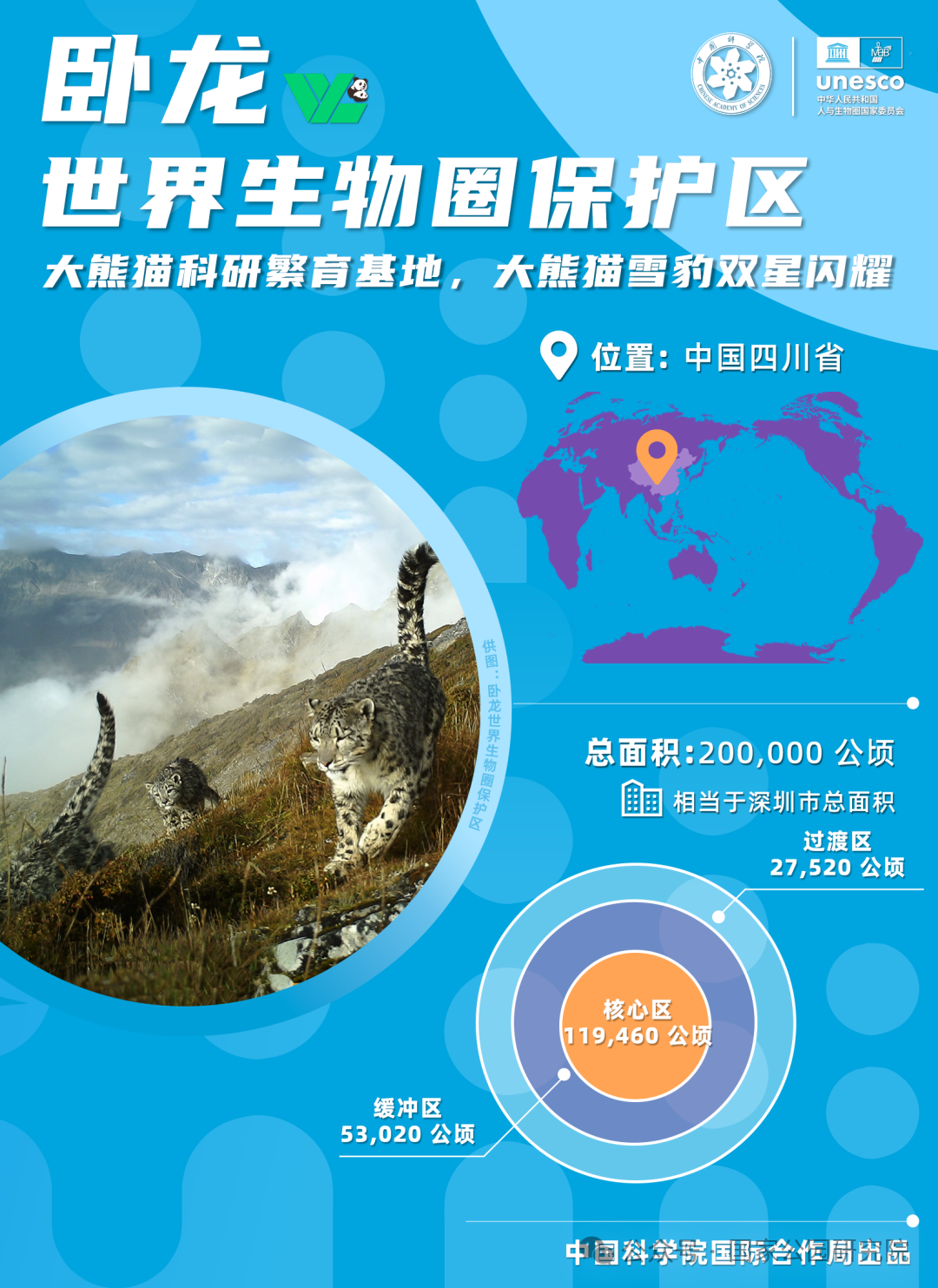 卧龙世界生物圈保护区是100多只野生大熊猫的家园还拥有全球最大的大熊猫饲养、繁殖和育幼基地,把大熊猫的问题解决好、研究透将为其他野生动物的保护提供良好示范。