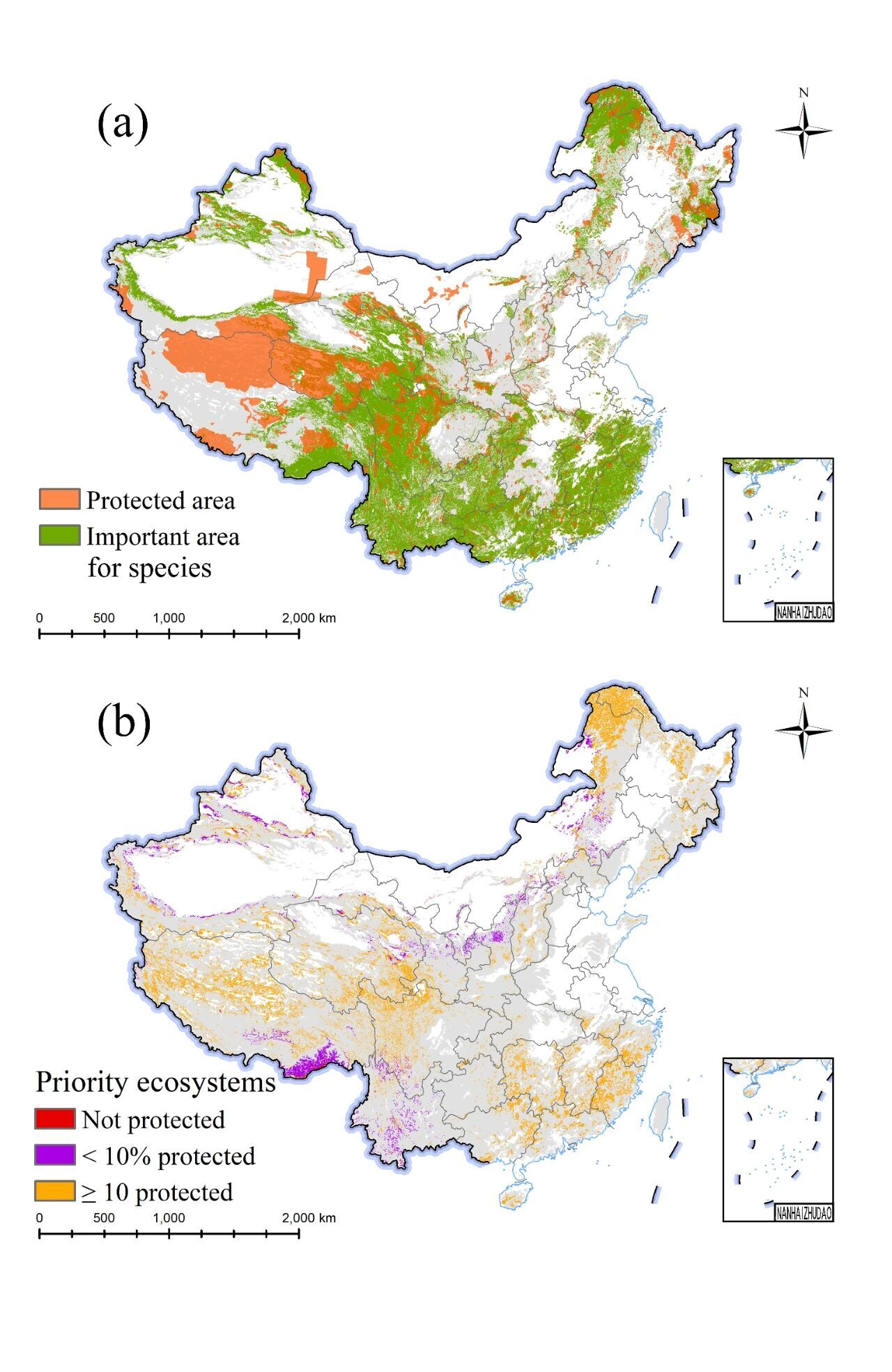 图2 Conservation status of important mountain biodiversity sites. (a) Overlap of protected areas with important areas for threatened species. (b) Protection status of priority ecosystems (at the ecosystem subclass level).