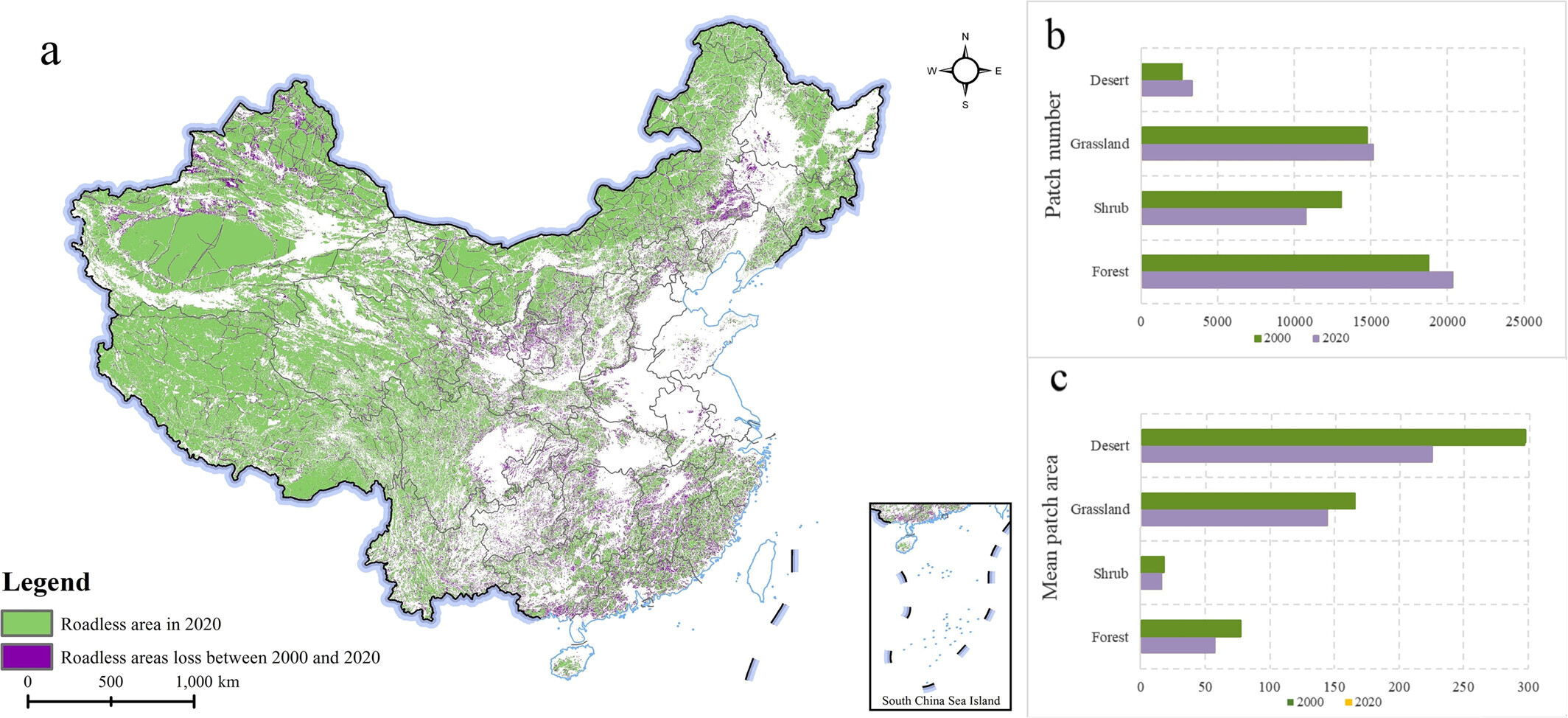 图1.2000-2020年间 (a) 无路区空间分布格局的变化;(b) 无路区中各生态系统类型平均斑块面积的变化; (c) 无路区中各生态系统类型斑块数量的变化